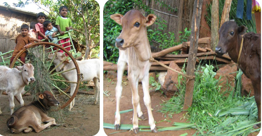 Today Maruti and his family rear 14 cattle of which 6 are cows named (dhavali, anjani, krishna, janki, laxmi, one to name) & 8 are bulls named (ram, laxman, balram, arjun, bhima, vittal, & 2 to name). Photo shows Maruti’s cows in front of his home.