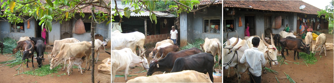 Today Maruti and his family rear 14 cattle of which 6 are cows named (dhavali, anjani, krishna, janki, laxmi, one to name) & 8 are bulls named (ram, laxman, balram, arjun, bhima, vittal, & 2 to name). Photo shows Maruti’s cows in front of his home.